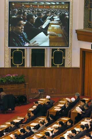 China's top political advisors attend the fourth plenary meeting of the Fourth Session of the 10th CPPCC National Committee at the Great Hall of the People in Beijing, March 10, 2006. [Xinhua]