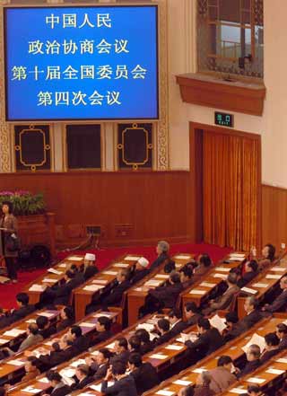 China's top political advisors attend the fourth plenary meeting of the Fourth Session of the 10th CPPCC National Committee at the Great Hall of the People in Beijing, March 10, 2006. [Xinhua]