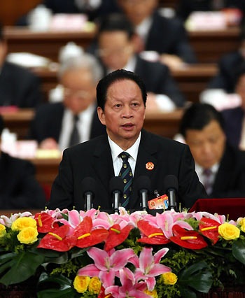 Xiao Yang, president of the Supreme People's Court, delivers his work report during a session of the National People's Congress at the Great Hall of the People in Beijing March 11, 2006. China's National People's Congress is in the middle of its annual session, with economic reforms and revival of the countryside among the top issues to be discussed. [Xinhua]