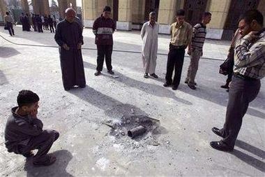 Iraqis look at mortar shell shrapnel outside the Abu Hanifa Sunni mosque in Baghdad, March 14, 2006. [Reuters]