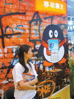 QQ for you: A woman rests in front of a billboard promoting QQ, the Chinese version of an instant messaging (IM) service, during a recent telecoms exhibition. IM services are becoming increasingly popular in China.
