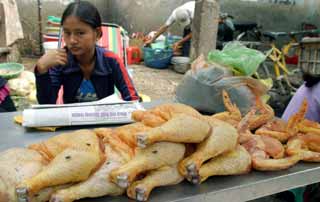 A girl sits near chicken meat for sale at a market in Ho Chi Minh City January 14, 2004.  [Reuters]