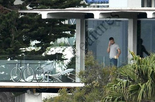 Brad was spotted chatting on his cell phone early this month from the balcony of his Malibu mansion.