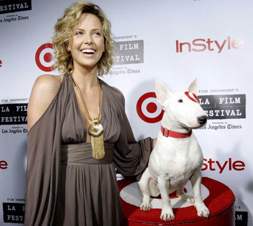 Honoree actress Charlize Theron pets Bullseye, a department store mascot, at the Los Angeles film festival's second annual Spirit of Independence award in Los Angeles June 28, 2006. REUTERS/Mario Anzuoni
