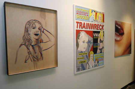 Several works of art featuring pop singer Britney Spears as the subject are shown at the "Just Britney" art show at the World of Wonder art gallery in Hollywood, California September 28, 2007. A stylized tabloid type portrait of Spears titled "Trainwreck" (C) by artist Sham Ibrahim is shown. The show opens September 28 and runs for two weeks. [Agencies] |