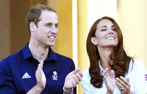 Britain's Prince William and his wife Catherine smile during the Eventing Jumping equestrian event at the London 2012 Olympic Games.