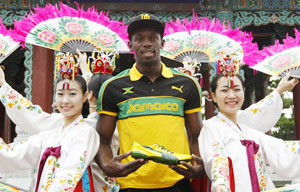 World record holder Usain Bolt of Jamaica poses with his new running spikes and promoters wearing traditional Hanbok before an interview with Reuters in Daegu, southeast of Seoul August 20, 2011.