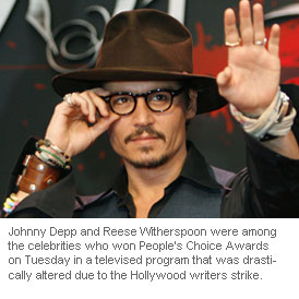 Johnny Depp and Reese Witherspoon were among the celebrities who won People's Choice Awards on Tuesday in a televised program that was drastically altered due to the Hollywood writers strike.
