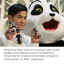 Hong Kong actor Aaron Kwok poses with crystal pandas as he attends a news conference in Hong Kong for a nature conservation program in China January 9, 2008. [Agencies]