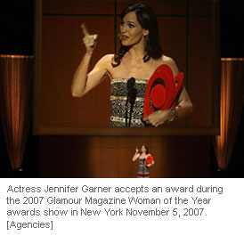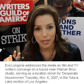 Actress Eva Longoria, star of ABC's 'Desperate Housewives, addresses the media as film and TV writers converge on a house near Warner Bros. studio, serving as a location shoot for 'Desperate Housewives' Tuesday, Nov. 6, 2007, in the Toluca Lake section of Los Angeles.