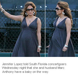 Jennifer Lopez told South Florida concertgoers Wednesday night that she and husband Marc Anthony have a baby on the way.
