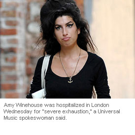Amy Winehouse was hospitalized in London Wednesday for "severe exhaustion," a Universal Music spokeswoman said.