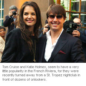 Tom Cruise and Katie Holmes, seem to have a very little popularity in the French Riviera, for they were recently turned away from a St. Tropez nightclub in front of dozens of onlookers.