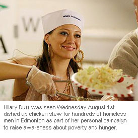 Hilary Duff was seen Wednesday August 1st dished up chicken stew for hundreds of homeless men in Edmonton as part of her personal campaign to raise awareness about poverty and hunger.