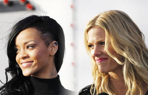 Cast members of the film "Battleship", including singer Rihanna, attend a news conference atop a flight deck of aircraft carrier USS George Washington at Yokosuka port, south of Tokyo April 2, 2012.