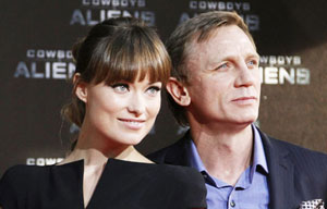Cast members Harrison Ford, Olivia Wilde and Daniel Craig pose for pictures as they arrive for the German premier of the movie 'Cowboys and Aliens' in Berlin, August 8, 2011.