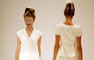 Models present creations from PINGHE by Chinese designer He Ping during London Fashion Week Spring/Summer 2014, at the Fashion Scout venue in London.