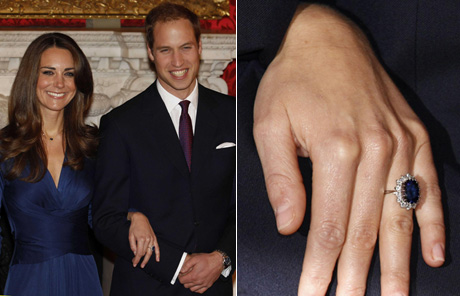 Kate Middleton (L) looks at the engagement ring given by her fiance, Britain's Prince William, as they pose for a photograph in St. James's Palace, central London November 16, 2010.