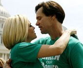 Actors Jim Carrey and Jenny McCarthy hug on Capitol Hill in Washington, Wednesday, June 4, 2008, during a rally calling for the elimination of toxins from children's vaccines. [Agencies]