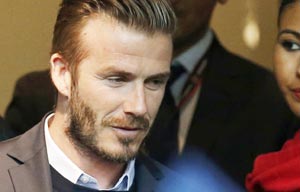 David Beckham takes his seat in the stands during their French Ligue 1 soccer match against Valenciennes at the Parc des Princes stadium in Paris May 5, 2013.