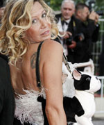 French actress Fiona Gelin carries a dog-shaped bag as she arrives on the red carpet for the screening of the film "Vengeance" at the 62nd Cannes Film Festival May 17, 2009.