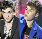 Robert Pattinson and Justin Bieber accept awards at the 2011 MTV Movie Awards in Los Angeles, June 5, 2011.