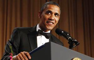 Barack Obama poked fun at his likely presidential rival Mitt Romney and Republican opponents in Congress on Saturday night, including a dig at Romney's treatment of a pet dog, at the annual White House Correspondents' Association dinner.