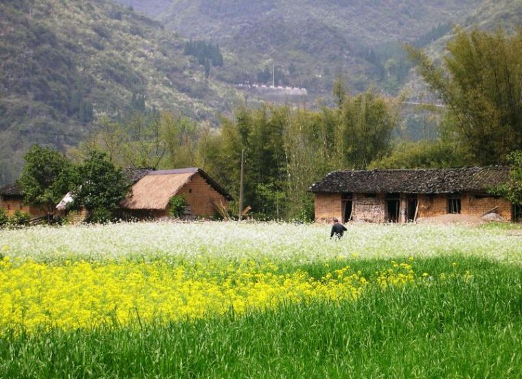 A cow is walking home from the fields while the peasant-in-charge casually strolled behind. They had just crossed a double-arched stone bridge over a river. Beside the track, straw was bundled up from recent harvesting. Meanwhile peasants continued with the planting in distant fields.