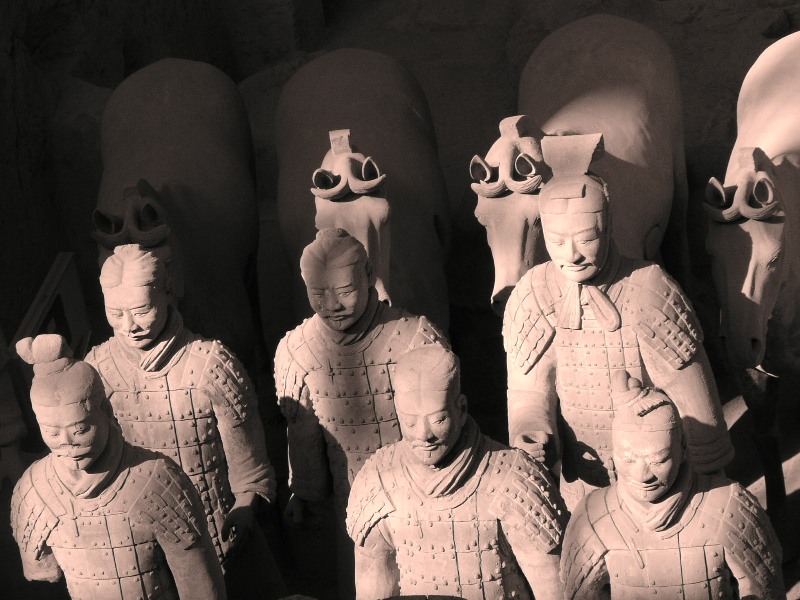 They are probably the best known burial figurines in the world - the Emperor Qin Shihuang's terrocotta warriors, or Qin Yong. Qin Shihuang, the first emperor of a unified China (259-210 B.C.), had a city-sized mausoleum guarded by a life-sized terracotta army, at the expense of numerous lives. In his underworld, 6,000-plus terracotta warriors formed the same battle array as the emperor's colossal army who had swept all the other six states and took him to the ruler of a united China. The foremost three rows of vanguards and the last three rows of rear guards were armed with crossbows, making a classic military array.. The warriors are 1.8 meters high on average - the tallest of their kind in the world. The horses, 1.7 meters high and 2 meters long on average, are numbered in the hundreds. Each is unique in their looks and facial expressions, and has realistic hairstyles. Qin figurines were fine works of Chinese sculptural art made through many