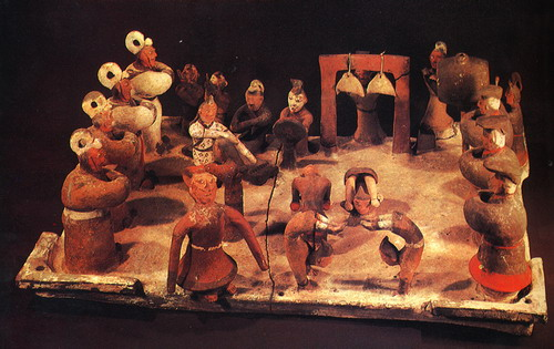 Dancers and acrobats Years of war followed after the collapse of the Qin Dynasty, leading to a weak economy in the following Han Dynasty (206 B.C.-220 A.D.). Even the emperor couldn't find four horses of the same color for his cart. The officers could only take rather slow oxcarts. Hence, the burial objects of the Han Dynasty couldn't hold a candle to Qin's grandeur. Though the figurines didn't shrink in number, they were much smaller-- 50-60 centimeters on average, about one-third of the average height of Qin terracotta. Life-sized figurines like Qin terracotta warriors were no longer made. Small as they are, the Han figurines were superior in sculptural art. The facial features were delicate and true to life. Individual facial expressions were presented with accuracy. The body figures were well-proportioned and elegant. Even the weapons and daily utensils in their hands were made of iron or bronze and were proportional to the height of the figurines. In the hand of a pottery figurine is a circular copper coin whose diameter is less than 1 centimeter. But on its face, two inscribed words indicating its face value, "半兩," were clearly visible. Tomb Figurines of the Warring Time