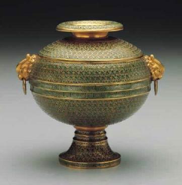 Specification: 10.1 centimeters in height, 7.1 centimeters in diameter. A Dou is a bronze food vessel of the Zhou Dynasty (1,100-256 BC). This one, made in the middle Qing Dynasty, is an imitation of the ancient work. With a ring pattern, the enameled Dou has a pair of ear-like handles, which represent two phoenix heads. Taken off, its lid could be used as a plate. |
