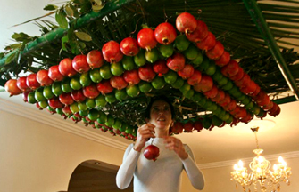 A Samaritan boy hangs fruit to the ceiling of his house ahead of Sukkot, the Feast of the Tabernacles, at Mount Gerizim near the West Bank city of Nablus.