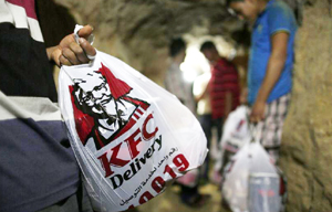 People deliver KFC food in the underground tunnel beneath the Gaza-Egypt border in the southern Gaza Strip city of Rafah on May 15, 2013.