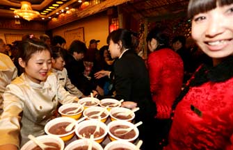 Quanjude Peking Roast Duck Restaurant’s Hepingmen branch gave away “eight-treasure” congee to residents in nearby communities on the morning of Jan 8.