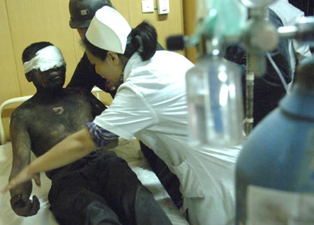 injured miner (L) receives medical check after
