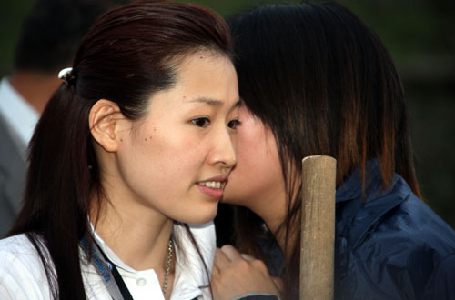 China's Olympic champion and Beijing Olympic Games torchbearer, swimmer Luo Xuejuan (L) talks with her teammate during a tree-planting activity in front of the tomb of Pierre de Coubertin, the chief founder of the modern Olympics Games in ancient Olympia, Greece March 23, 2008. The ceremony will be officially held at 11 o' clock a.m. on Monday local time. [Xinhua]