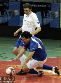 歐盟委員會主席巴羅索和對方球員爭搶時摔倒。(美聯社)