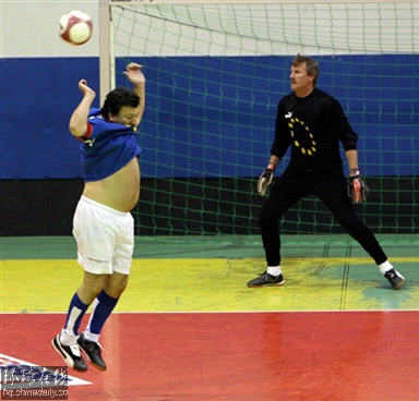 歐盟委員會主席巴羅索跳起頂球,肚皮露出一大片。(美聯社)