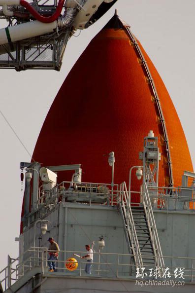 日,肯尼迪航天中心工作人員,為即將升空的“發(fā)現(xiàn)”號(hào)作發(fā)射前的準(zhǔn)備。