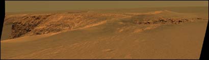 “機遇號”的全景攝像頭自9月28日以來拍攝的高清晰度彩色照片揭示了以前沒有見到的巖層,這些巖層說明火星的環境發生過變化。火星地表的懸崖有好幾百米高,巨大的石塊直徑約為1.8米至2.7米。斯奎爾斯說,巖石的年代大概已十分久遠,“種種證據”表明它們曾遭受過水淹。