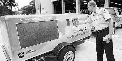 水魔法公司的工程師大衛(wèi)·理查德正在展示該公司生產(chǎn)的可移動的煉水機。這種機器每天可以從空氣中提取120加侖(約合545.5升)的飲用水。