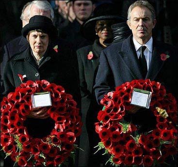 身穿黑衣的女王向紀念碑敬獻了花圈,并與眾人一道默哀兩分鐘。英國首相布萊爾及主要政府官員、軍方將領和數千名退役老兵參加了這次活動。