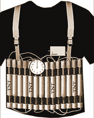據(jù)報(bào)道,這款“人彈T恤”布料大多呈黑色,消費(fèi)者可以通過互聯(lián)網(wǎng)訂購,每件標(biāo)價(jià)17英鎊。在這件T恤的肩部,印有兩根吊帶,腰間部分印滿了一根根“TNT雷管”,其中每根都通過導(dǎo)線連接著一只計(jì)時(shí)器。由于圖案印刷逼真,乍一看很是嚇人,誰穿上它都難免被誤當(dāng)成恐怖組織的“人彈”。至于設(shè)計(jì)這種產(chǎn)品的初衷,經(jīng)銷商稱:“推出這款T恤只是為了搞笑。”