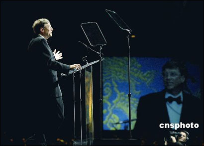 當地時間十一月十五日晚,硅谷重鎮圣荷西的科技創新博物館舉行盛大頒獎典禮,比爾·蓋茨獲得了二零零六年詹姆斯·摩根國際慈善家大獎。圖為比爾·