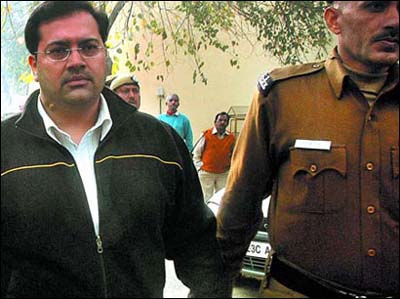 夏爾馬雖然已經是一個跨國公司的主管,但是他和他的朋友維卡斯·雅達夫仍然被逮捕了,現在在新德里的第四監獄。而且具諷刺意味的是,也許印度人民實在痛恨這個蛀蟲,第四監獄的獄警表示:“最初他們沒有被分派什么工作,不過現在我們準備讓他們做一些事情。”而夏爾馬在監獄內也只能和其他犯人一樣吃木豆之類的食物,獄方稱他們每周可以有兩次半個小時的探訪時間以及要和其他犯人一起參加集會和練習瑜珈。
