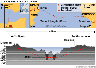 負責設計歐非海底隧道的是瑞士工程師喬瓦尼?隆巴爾迪,雖然他曾參與瑞士哥達隧道、法-意白朗峰隧道等多項重大工程的設計和施工,但他認為,歐非海底隧道是他職業生涯中最嚴峻的挑戰,“世界上沒有任何其它工程能與之相比”。
