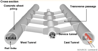 歐非海底隧道的工程藍圖顯示,海底隧道將由兩個直徑10米的平形列車主隧道構成,可以雙向通車,運載旅客、貨物等。主隧道中間還有一條直徑7米的平行的緊急隧道,三條縱向隧道之間各有四條橫向的連接隧道,可以互通。