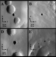 THEMIS)獲取的火星地表圖片,并發(fā)現(xiàn)在一處凹陷的地區(qū)存在七個(gè)直徑大約在100至252米的地下洞穴。雖然其洞底和洞壁無法見到陽光,但在其洞頂卻留有“天窗”。數(shù)據(jù)顯示,這些洞大約有80米深。