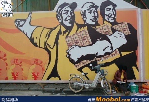 這幅巨大的戶外廣告主角是幾十年前人們再熟悉不過的工農(nóng)兵兄弟們,淳樸勤勞的工人兄弟還是那個樣子,所不同的是,這幾位工人兄弟手里握著的不再是鐮刀、鋤頭,而是大把的美圓。神情歡快,憧憬美好未來的模樣。