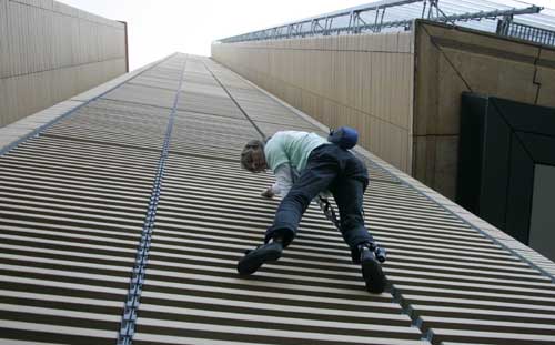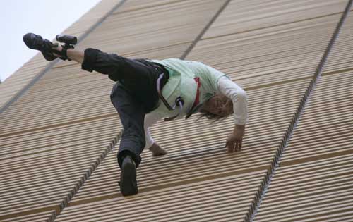 羅伯特18日攀登德比斯大廈時(shí),有大量柏林市民跑到樓下圍觀拍照,并為“蜘蛛人”加油。羅伯特也十分興奮,登上樓頂后向觀眾們揮手致意。有意思的是,柏林警察知道這位法國(guó)人“訓(xùn)練有素”,并未干涉他的攀爬活動(dòng),只是等他下來(lái)后才將其拘捕。羅伯特可能被控非法侵入。